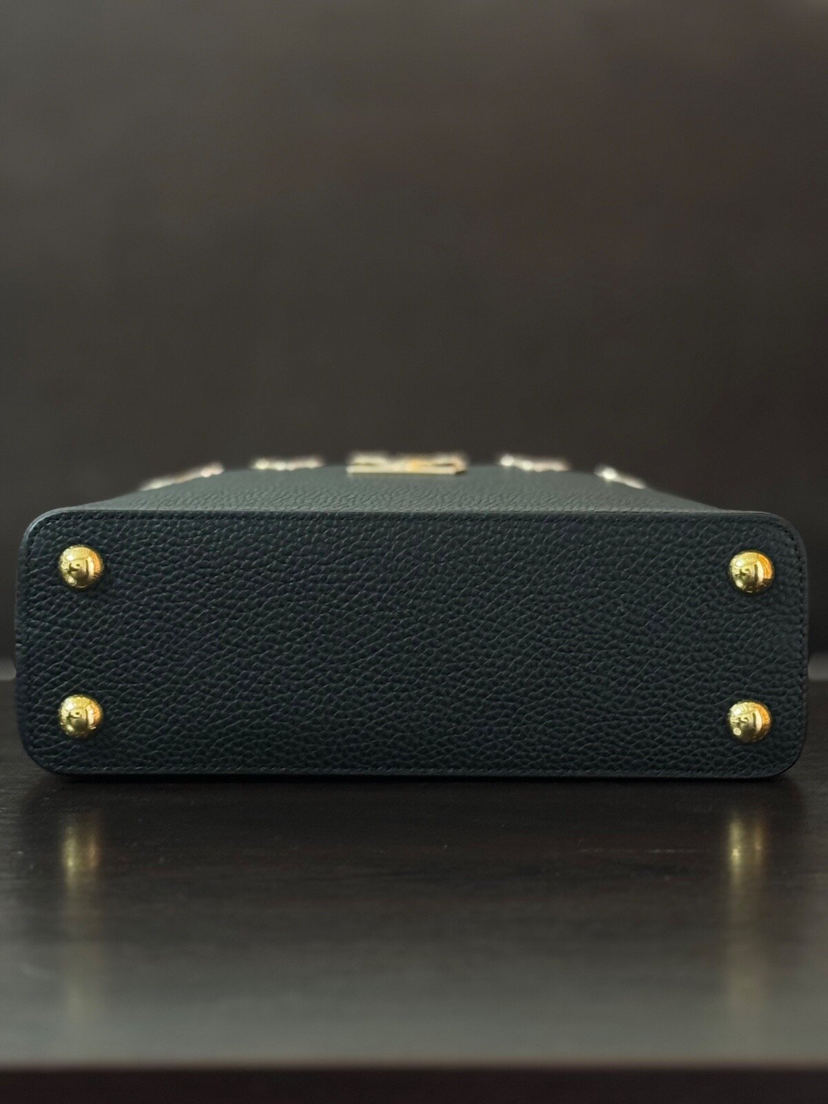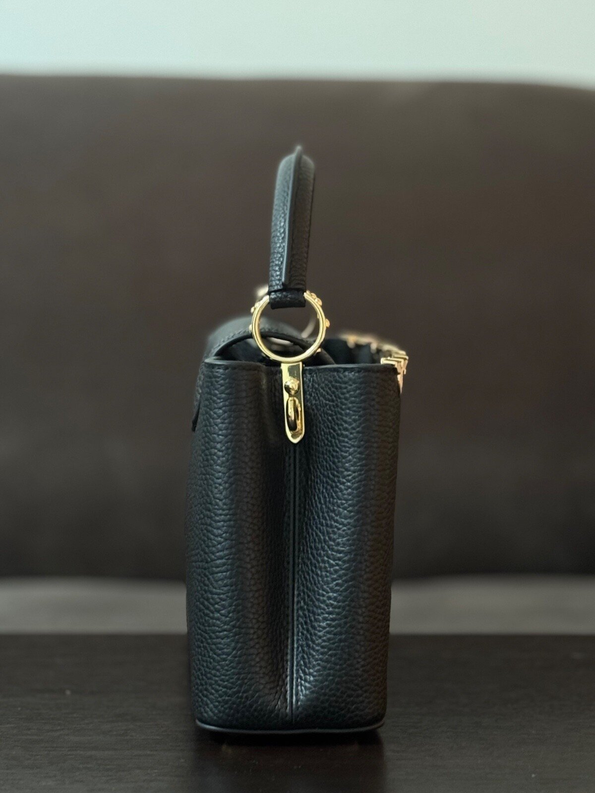 Sac à main noir en cuir embossé LV, ferrures dorées élégantes et finition raffinée.